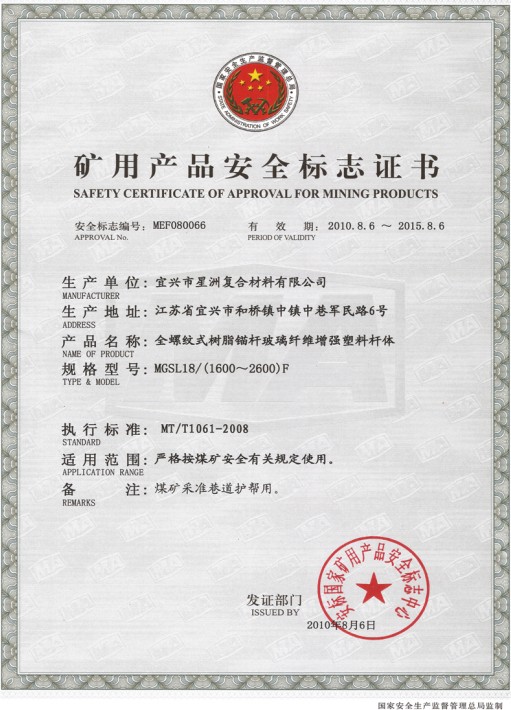 全螺纹玻璃钢锚杆安标证(MA)